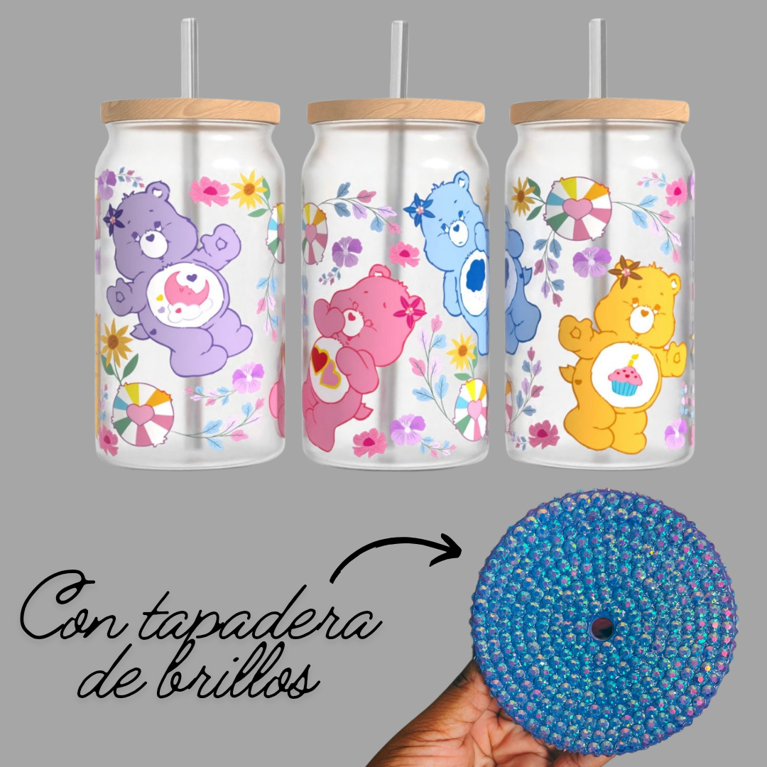 Vaso sublimado con pajita y tapa de bambú con brillos